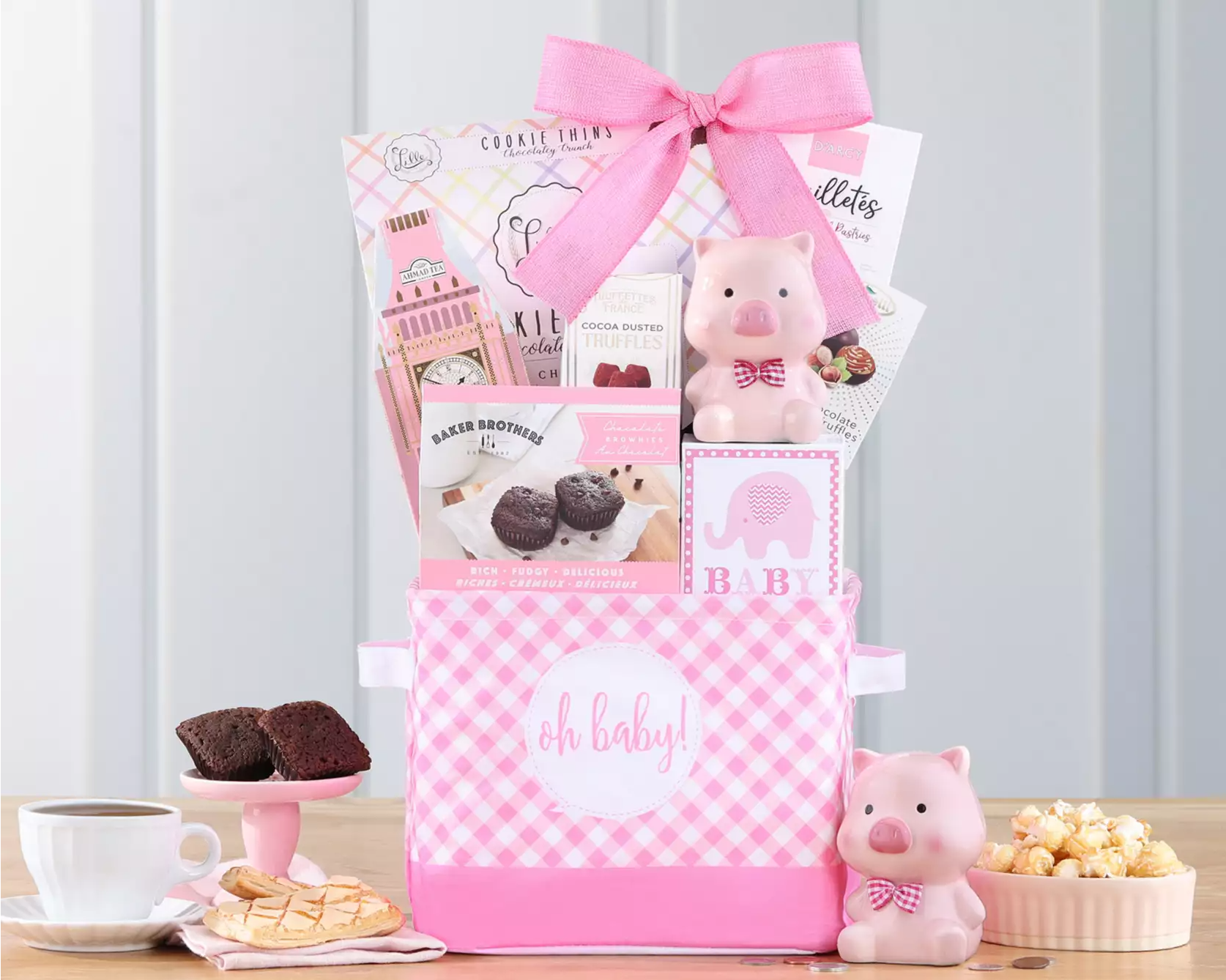 Celebrate the arrival of a baby girl with Oh Baby! Pink Gift Basket. This adorable gift includes a teddy bear, piggy bank, treats like pastries and candy, and even tea for mom. Show your love and support with this perfect surprise.