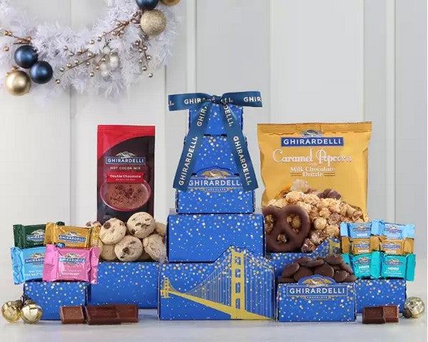 Indulge in a luxurious Ghirardelli Chocolate gift tower, overflowing with a decadent selection of treats. This exclusive collection includes an irresistible assortment of milk and dark chocolate caramel squares and minis, chocolate mint, chocolate chip cookies, milk chocolate drizzled popcorn, rich 72% cacao Intense Dark Chocolate, double chocolate hot cocoa, crisp dark chocolate wafers, milk chocolate pretzels, and dark chocolate filled with luscious raspberry. Perfect for gifting or savoring yourself!