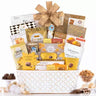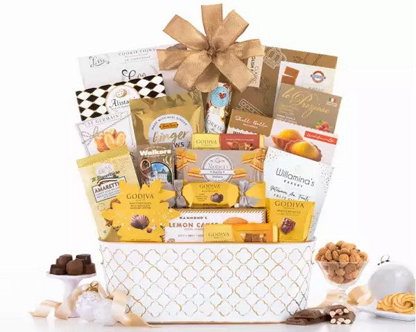 A Luxurious Gift Brimming with Gourmet Delights. Treat someone special to a lavish assortment of Godiva's finest creations, paired with an irresistible variety of sweet indulgences. This golden metal basket overflows with decadent Godiva treats including milk chocolate with ganache, dark chocolate with ganache, dark chocolate with smooth caramel, lemon cakes, chocolate cookie thins , pastries and more. An unforgettable gift for any occasion.