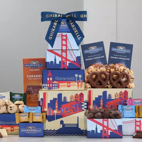 Indulge in the rich tradition of Ghirardelli Chocolate Company with our Deluxe Ghirardelli Tower. This exclusive gift tower features an assortment of decadent milk and dark chocolate treats, such as caramel squares, pretzels, and cookies. Complete the experience with dark chocolate wafers, drizzled caramel corn, and a bar tablet caramel milk chocolate. Perfect for any chocolate lover on your gift list.