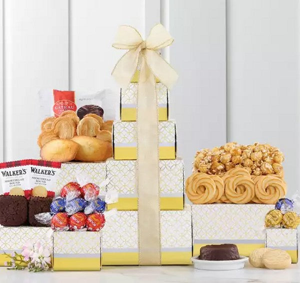 Indulge in a tower of happiness with this Lindt Chocolate and Sweets Tower. Gift a delectable assortment of Lindt chocolates, pastries, Chocolate Sauce Souffle Cake, caramel corn, and more. Each of the five golden boxes holds a surprise, topped off with a bow. Handmade and wrapped with care.
