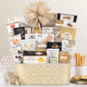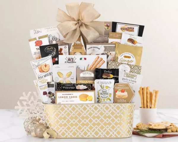 Looking for a unique way to say thank you? Say it with the Many Thanks Gourmet Gift Basket! This basket is packed with delicious vanilla fudge with sea salt, Lille chocolate cookie thins, basil thyme artichoke snacks, garlic herb crackers, smoked Gouda cheese spread, Lindt milk chocolate truffles, olives, ginger chews, Ahmad English tea, puff pastry, blackberry and raspberry fruit jelly candy, lemon cakes, strawberry and coconut chocolate waffle cookies, brownies, Truffettes dark chocolate truffles, madeleine cakes and more. Show your appreciation and spread some joy with this gourmet gift basket.
