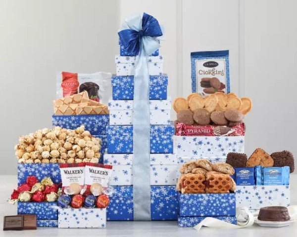 Indulge in holiday decadence with our Let it Snow Gift Tower. This seven-story tower is adorned with snowflakes and filled with luxurious treats like Ghirardelli chocolates, Lindt truffles, and Gateau Celeste chocolate souffle cake. Satisfy your sweet tooth with this elegant and exclusive gift for winter and the holidays.