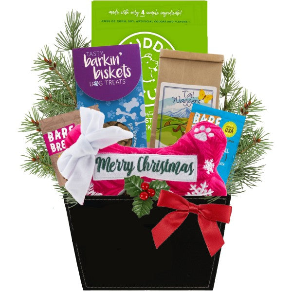 Show your favorite canine friend just how special he is this Christmas with a beautiful Christmas dog gift by Bisket Baskets. Artfully arranged inside this gift Fido will find a yummy selection of bakery fresh biscuits and even a new plush holiday bone for play. Celebrate the season and don't forget to include your protectors and 4-legged companions this year.