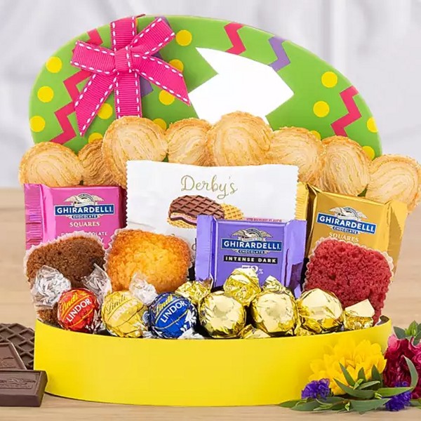 Indulge in a playful Easter treat with our Easter Egg Chocolate Assortment! This unique gift box is filled with a collection of Ghirardelli® squares including dark chocolate raspberry, milk chocolate caramel and 72% cacao dark chocolate, Lindt milk, white and dark chocolate truffles, milk chocolate hazelnut pralines, puff pastries, a strawberry chocolate waffle cookie, lemon, raspberry and cookie butter cakes.