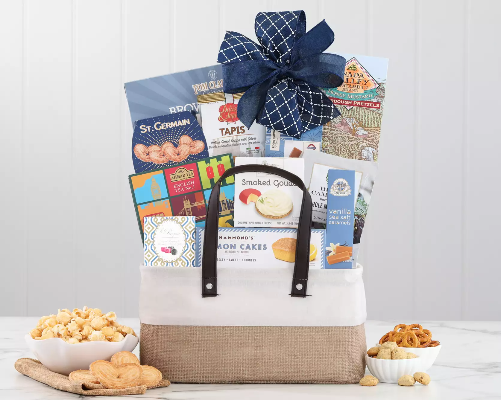 The Gourmet Delight Gift Basket is your secret weapon for spreading joy! Bursting with ten carefully chosen delights—from creamy Vino e Formaggio smoked gouda spread and tangy Bella Campagna olives to sweet vanilla fudge with sea salt, aromatic English tea, crispy honey mustard sourdough pretzels, buttery brown butter kettle corn, tender lemon cakes, flaky puff pastries, indulgent vanilla sea salt caramels, and savory olive oil Italian pretzels—this basket has something for every palate. Perfect for celebrating with family, delighting friends, or impressing clients. It's gourmet goodness that keeps on giving!