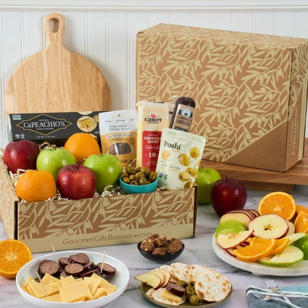Indulge in a gourmet feast with our Farmer's Market Gift Box! Packed with delicious fruits, crackers, cheese, sausage, and olives, this selection captures the essence of a farmers market. Perfect for any occasion, this gift box offers the best value in fruit gifts.