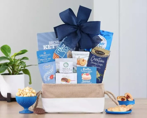 Show your appreciation with this thoughtfully curated gourmet gift basket, featuring a delicious assortment of sweet and savory treats. Inside, you'll find Bella Formaggio gourmet cheese spread, Lindt Lindor milk chocolate truffle balls, brown butter kettle corn, Wilamina's Bakery fruit filled pastries, Bella Campagna mixed olives, Grona Palmiers pastries and more. It’s the perfect way to thank someone special for their support.