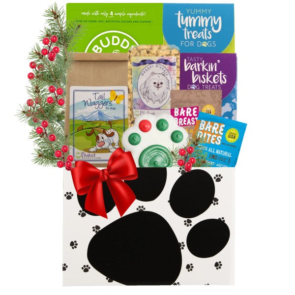 Treat your favorite pup to a festive surprise with the Holiday Dog Pound Dog Gift Basket, a fun dog gift basket filled with lots and lots of tasty dog biscuits and gourmet dog treats. If you're searching for a Christmas dog gift, you’ve found the perfect one right here in our Dog Pound.